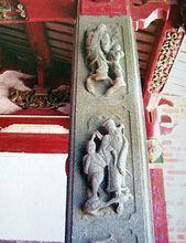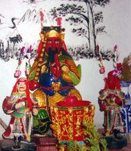 宮中奉祀的主神“薛法師公”皇封“光祿大夫”(左上圖),乃是一千多年前薛山(泗洋)的開(kāi)山鼻祖,故唐朝薛家先祖百丈(大洋三角埕)鎮(zhèn)將薛延輝(薛仁貴后裔)引退后擇地安家泗洋前岫,(今村中尚存薛將軍的唐代古墓)。果然后代薛奕在宋熙寧九年(1076年)魁奪武狀元,與同科莆田文狀元徐鐸有“一方文武魁天下”之譽(yù)。神宗皇帝龍顏大悅,委薛奕以重任,后薛奕將軍在抗擊胡虜時(shí)不幸在寧夏銀川英勇捐軀。薛公法德高深,不但普施法藥為民驅(qū)邪解病,還以理育人,留下許多法術(shù)故事至今仍在山區(qū)鄉(xiāng)村傳為美談。因薛師公德高望重,其夫人“薛師媽”和其子“文武二將”亦被后人一同奉祀宮中。左右偏殿供奉九使公(右上圖)和社主明王等神。宮東邊筑有廣場(chǎng)和大戲臺(tái),用于每年農(nóng)歷二月初二演莆仙戲。正月初十至十四元宵圣像出游,合村慶迎,非常熱鬧。