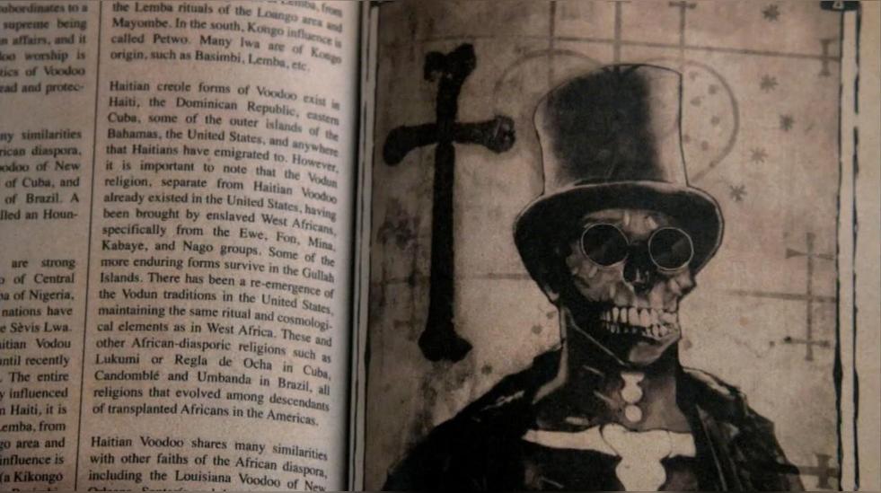Baron Samedi要出現(xiàn)在墓地的話,必須要有紫羅蘭花,十字架和蠟燭。當(dāng)人們想要召喚他的時候,一般會采用石塊互相打擊來制造噪聲或者是用砍刀敲打石頭做的墓碑十字架3次。其正體是巫毒教一種不可見的力量,常以黑人形象出現(xiàn),有時候也被描述為骷髏人。當(dāng)他不是以骷髏形象出現(xiàn)時,一般頭戴圓筒帽,手持手杖,并蓄著長長的白胡子。''沒有他的允許而打開一個墓穴是很危險的事情。''