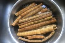干竹筍泡發(fā)洗凈,一般2-5天時(shí)間泡發(fā),泡發(fā)期間要注意換水保持干凈,泡發(fā)后的竹筍會(huì)變軟、能切塊。