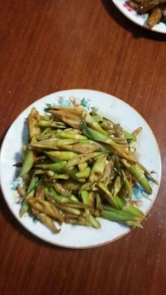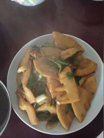 滾刀狀,開水燙一下,油七成熱姜蒜下鍋倒入筍加輔料爆炒至出鍋