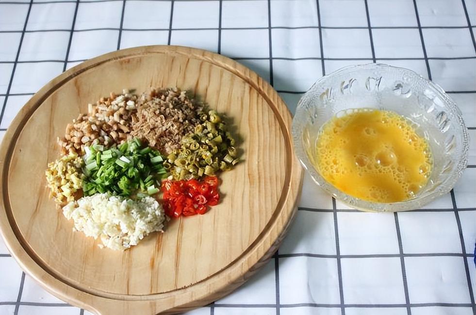 2.姜蔥蒜,小米椒,泡豇豆,大頭菜,折耳根如圖所示切好。雞蛋打散待用。