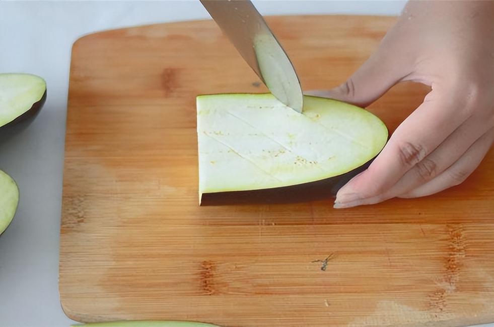 將茄子洗凈對剖對半切開,分成4段,切面上劃開幾道