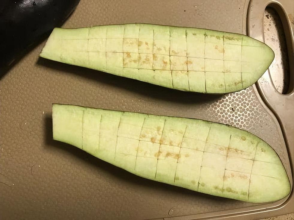 茄子洗凈切半,中間用刀劃成如圖格狀,不要切斷。