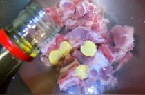 起油鍋倒入少許油,放入老姜煸香倒入排骨翻炒,肉變色即可,噴入少許黃酒。