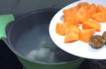 步驟四把豬骨、山藥、胡蘿卜、姜片和水一起放進(jìn)湯鍋里
