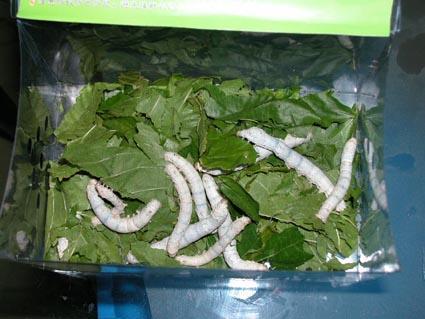 五齡蠶的長度大概有手指長短,手指一半粗,五齡蠶不久就會吐絲結(jié)繭了。在這段時(shí)間千萬不要碰它,不然會使蠶受到驚嚇,導(dǎo)致無法吐絲。因?yàn)槲妪g蠶結(jié)繭時(shí)不吃桑葉,所以盡可能不要動。