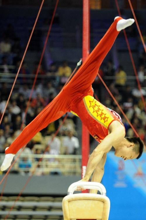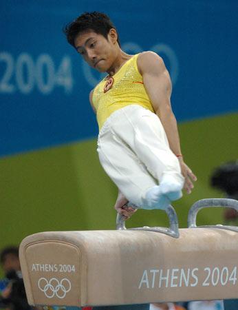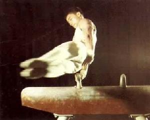 其實,在男子競技體操六個項目中,鞍馬是最難“馴服”的。在平日的訓練中,運動員花費在它上面的時間最多、精力最大。因為鞍馬的支撐面積很小,完全要用兩只手控制,是身體重心變化最多、最快的一個項目。有些單環(huán)動作,只能由兩只手交替握在一個環(huán)上才能完成,這樣一來,手的支撐面積就更小了。在這樣窄小的支撐面積內(nèi),運動員必須不斷地變化動作,再加上評分規(guī)則當中,除分腿交叉動作允許腿接觸器械以外,其他動作不允許除手以外的其它任何身體部位接觸器械(包括馬環(huán)),所以稍有閃失,就會碰馬或從馬上跌落下來。