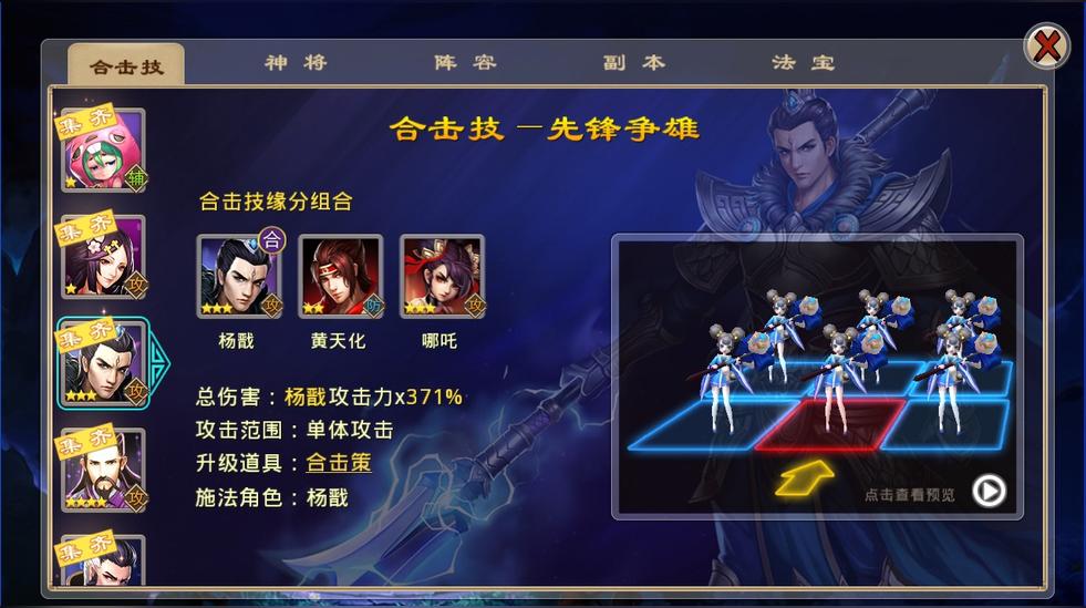《封神英雄榜》中最強(qiáng)大的技能類型當(dāng)屬“合擊技”,合擊技是由擁有緣分的神將組合而成(并非所有緣分均有合擊技),由緣分神將中一位集合眾人之力釋放的。合擊技一出,將對敵人造成成噸傷害。