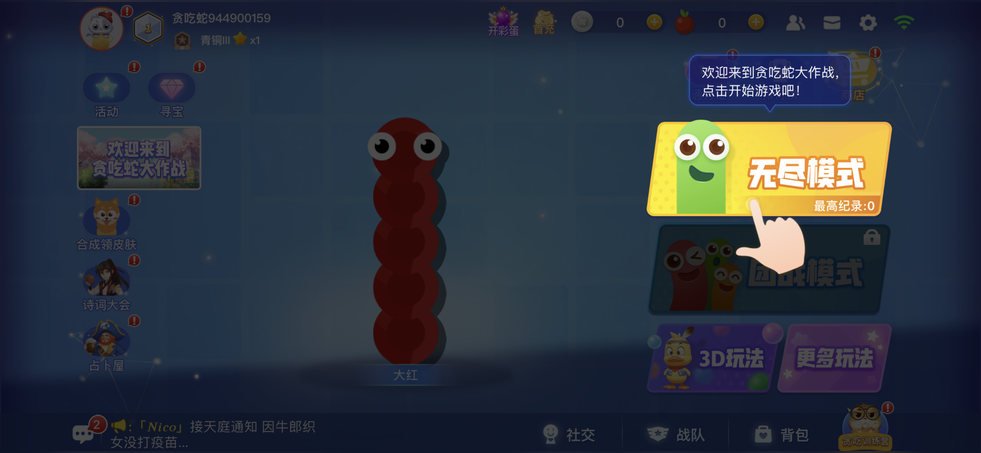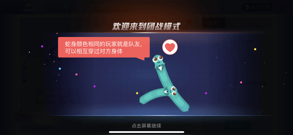 (3.0以上可見)游戲聯(lián)網(wǎng),時間無限(但時間到60分鐘會強(qiáng)制結(jié)算),每隊(duì)最多5人,有紅、藍(lán)、綠三隊(duì),隊(duì)伍長度達(dá)到4000即可獲勝。1.控制搖桿走位玩家的小蛇,吃掉地圖上彩色的小光點(diǎn),就會變長。2.蛇頭碰到其他貪吃蛇就會死亡,并且產(chǎn)生大量小光點(diǎn)。3.長按加速鍵,用巧妙的走位讓蛇身被別人撞上,即可以吃掉他們。4.團(tuán)戰(zhàn)BOSS擊殺可獲得全隊(duì)加速速度提升狀態(tài)。5.團(tuán)戰(zhàn)道具有護(hù)盾、吸鐵石。護(hù)盾拾取后須手動使用,獲得5秒的無敵時間。吸鐵石可以在短時間內(nèi)增大吸力的范圍。6.團(tuán)戰(zhàn)中有移動星星(但有時不是星星)拾取可獲得更大的長度。