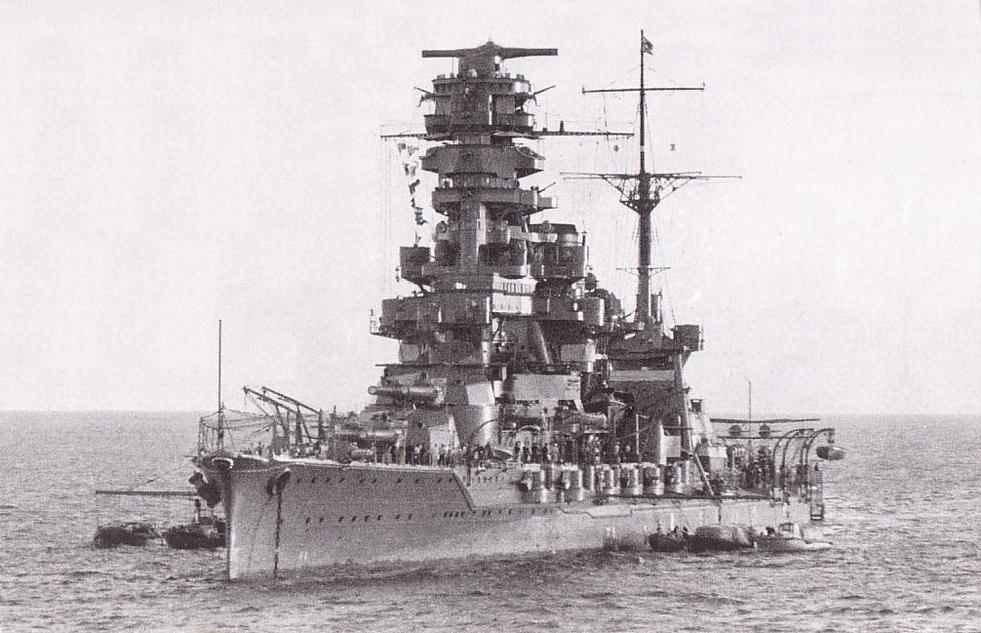 首先,全部的主炮除了最后一座炮塔至第六 號(hào)炮塔由于空間的問題以外,其最大仰角都從之前幾次改裝后提升到的三十度角,進(jìn)一步加大到了四十三度,最大射程達(dá)到三萬三千米,同時(shí),主炮射擊裝置也有所更新,在前桅樓的頂端裝設(shè)了巨大的基線長(zhǎng)十米測(cè)距儀。副炮方面,最大仰角從原來的二十度增加到了三十度,射程延伸到一萬五千米,另外,副炮裝設(shè)處的形狀也有所改變,原來副炮上一層的甲板是平整的舷側(cè)弧線,在此時(shí)改成了鋸齒狀來配合副炮炮座。加上上一次改裝中拆除的兩門架設(shè)于第一煙囪旁甲板上的兩門副炮,原本二十門的副炮數(shù)量現(xiàn)在只剩下十六門。