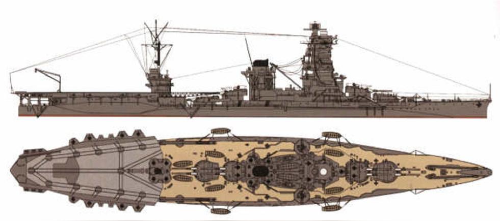 為了指揮飛行甲板的操作,在后桅樓上架設(shè)了射出指 揮所。原來裝設(shè)在艦尾甲板的起重機(jī),被抬高到了飛行甲板上以供吊放戰(zhàn)機(jī)使用。戰(zhàn)機(jī)使用的汽油槽、炸彈庫(kù)等設(shè)施則被架設(shè)在原有的第五、第六炮塔彈藥庫(kù)中,充分利用戰(zhàn)艦炮塔彈藥庫(kù)防御力較高的優(yōu)點(diǎn)。搭載的油量以及彈量足夠全艦戰(zhàn)機(jī)出擊三次使用。原來撤去的炮塔遺跡上則覆蓋以 150mm 的裝甲板保護(hù)。改裝完成
