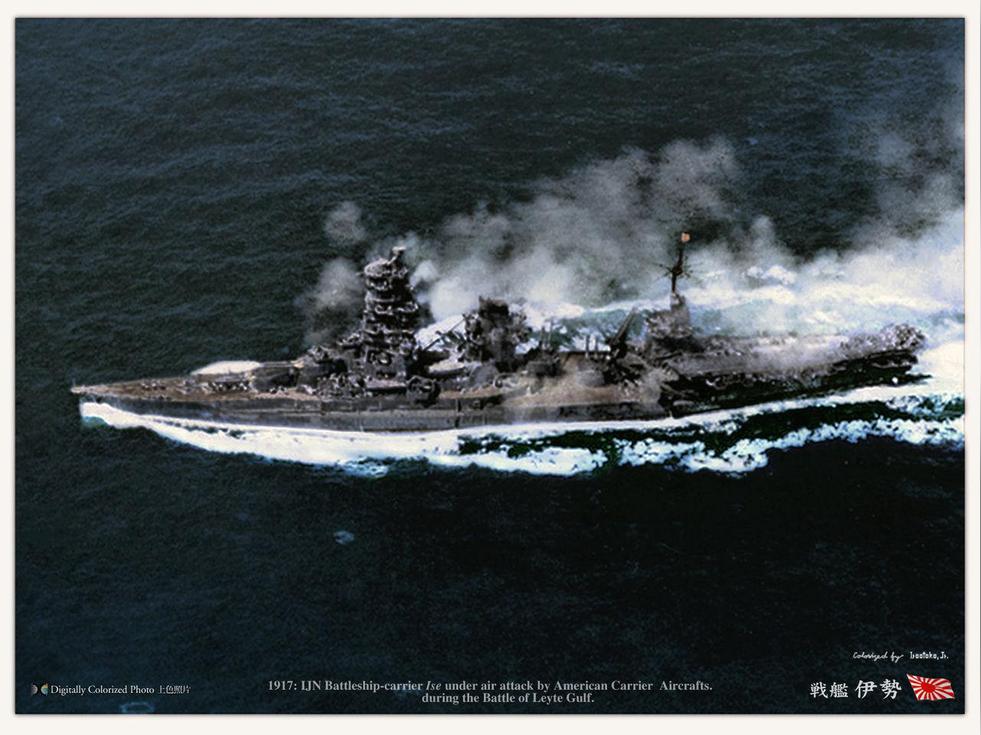 昭和十九年(1944)十月中,美軍組織了前所 未見的大艦隊(duì),浩浩蕩蕩的往菲律賓殺來,日軍緊急拉響警報(bào),發(fā)動(dòng)了捷一號(hào)作戰(zhàn)。在捷一號(hào)作戰(zhàn)的編制里,航空戰(zhàn)艦伊勢(shì)號(hào)及其姊妹艦日向號(hào)仍隸屬第一機(jī)動(dòng)艦隊(duì)第三艦隊(duì)下的第四航空艦隊(duì),該航空艦隊(duì)以兩艘伊勢(shì)級(jí)航空戰(zhàn)艦組成,與由四艘大小航空母艦組成的第三航空艦隊(duì)同屬小澤治三郎將軍的領(lǐng)導(dǎo)下。在捷一號(hào)作戰(zhàn)計(jì)劃中,小澤艦隊(duì)的任務(wù)是由菲律賓東北方海域逼近戰(zhàn)場(chǎng),以自身作為誘餌引誘敵軍航空母艦部隊(duì)北上,好讓暗藏于菲律賓西方的主力水面艦隊(duì)能一股作氣沖殺至萊特島殲滅登陸敵軍,是史上難得一見的“誘餌艦隊(duì)”。