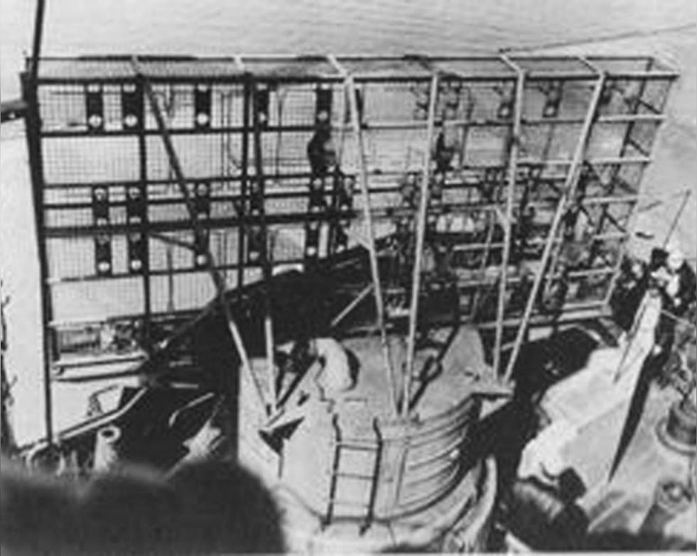前桅樓由于需要更多的空間來裝置設(shè)備,原來的三腳 桅所能架設(shè)的空間有限,于是在三腳桅后面架設(shè)了直達(dá)桅頂?shù)难a(bǔ)助支撐鋼架,使得前桅樓每層艦橋的面積都向后大幅增加,原本具有細(xì)長(zhǎng)外觀的前桅樓一舉放大了兩倍寬度。另外,后桅樓也有擴(kuò)建,向上增蓋了數(shù)層建物,在其上裝設(shè)了主炮的預(yù)備射擊方位盤以及副炮用的方位盤等設(shè)備。原本高大的后三角桅也有極大的改變,三角桅中的兩根支撐桅被裁去到后部艦橋以上的部分,后桅上部原有高大十字型的結(jié)構(gòu)也都被除去,改成了一根較短的延伸桅,以及兩根從中間向左右張開約三十五度的桅,主桅柱頂?shù)乃絏型張線架也有延長(zhǎng),并且加裝了支撐架。