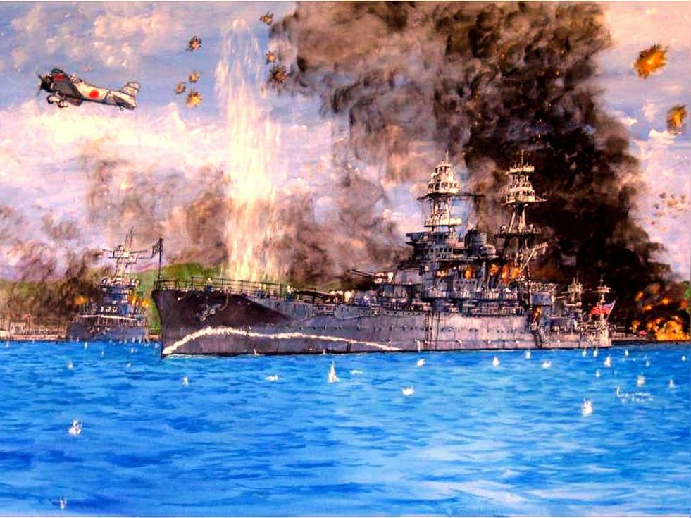 1941年12月7日(星期日)清晨,在珍珠港中央的福特島 東南側(cè),停泊著美國太平洋艦隊8艘戰(zhàn)列艦中的7艘,除了單獨停泊的"加利福尼亞"號外,有6艘戰(zhàn)列艦密集停靠在一起,其中"俄克拉荷馬"號位于最前端的外側(cè),而"內(nèi)華達"號則獨立停在最末尾。"內(nèi)華達"號是當時港內(nèi)最老的戰(zhàn)列艦。7時58分,日本軍隊突襲機群到達珍珠港上空,空襲開始。