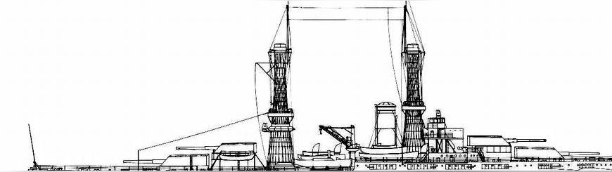 該級艦采用重點防護概念的裝甲設計,是戰(zhàn)列艦防護設計上的重大革新,其設計思想被后續(xù)其他各國海軍所借鑒。艦上安裝10門356毫米口徑主炮,雙聯(lián)裝和三聯(lián)裝主炮炮塔各兩座,采用艏艉對稱的布置形式。