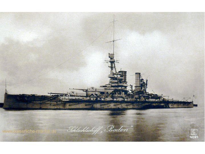 1916年10月13日,巴登號戰(zhàn)列艦開始進(jìn)行交接后的第一次試航。1917年3月14日,“巴登”號編入公海艦隊擔(dān)任艦隊的總旗艦。