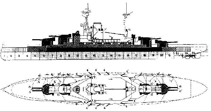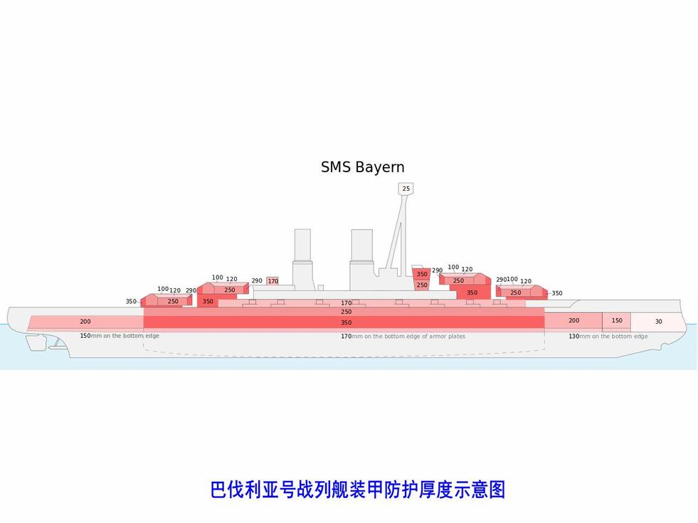 巴伐利亞級戰(zhàn)列艦裝甲厚度示意圖