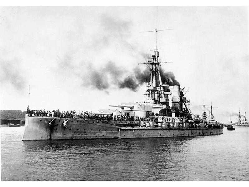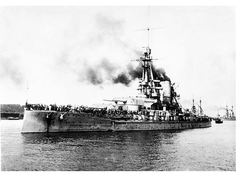 第一次世界大戰(zhàn)結(jié)束時,包括巴伐利亞號戰(zhàn)列艦在內(nèi)74艘德國軍艦被協(xié)約國扣押。這支艦隊于1918年11月19日根據(jù)停戰(zhàn)協(xié)定由駛往英國斯卡帕灣,21日抵達(dá)錨地后鍋爐熄火接受協(xié)約國的監(jiān)督。英國海軍發(fā)現(xiàn)德國“馬肯森”號未建成后,又要求“巴登”號開往斯卡帕灣,巴登號艦于1919年1月7日駛抵斯卡帕灣。