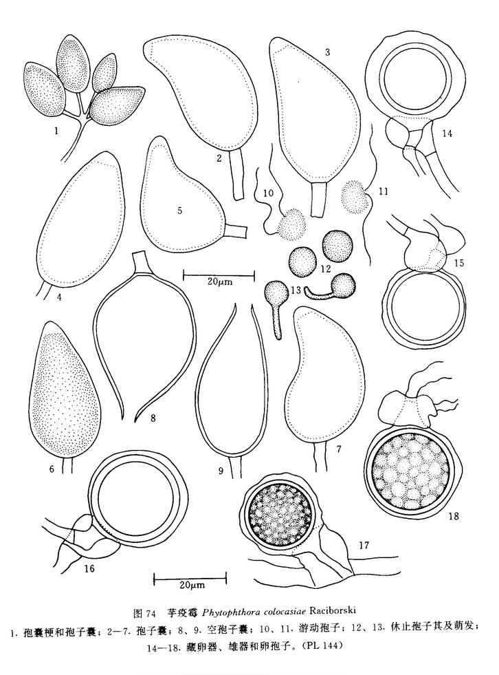 Phytophthoracolocasiae?Raciborski首次從芋葉上分離出并由Raciborski(1990)命名。雖然后來曾被Sarejanni(1936)改名為?P.?parasitica?Dastur?var.?colocasiae?(Raciborski)?Sarejanni,但是多數(shù)學(xué)者認(rèn)為本種的孢子囊等與P.?parasitica(=P.?nicotianae)有區(qū)別,應(yīng)為一獨(dú)立的種,即P.?colocasiae(Tucker,1931)。本種的寄主的范圍狹窄,僅報(bào)道寄生于天南星科?Araceae的兩個(gè)屬(Colocasia和Xanthosoma)上(?Ribeiro,1978)。