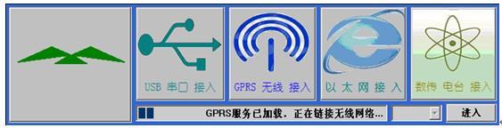 如下圖所示,啟動軟件系統(tǒng)后,點(diǎn)擊“GPRS無線接入”圖形按鈕,軟件將自動連接移動無線網(wǎng)絡(luò)(根據(jù)網(wǎng)絡(luò)狀況,這里將會等待約5-60秒時(shí)間,請耐心等待)。連接成功后,系統(tǒng)自動進(jìn)行設(shè)備初始化。初始化成功后“進(jìn)入”按鈕有效,否則請重新按一次“GPRS無線接入”按鈕,直至提示初始化成功。此時(shí),點(diǎn)擊“進(jìn)入”按鈕即可進(jìn)入系統(tǒng)主界面。