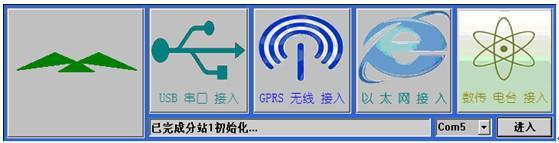 如下圖所示,插入U(xiǎn)SB/485通訊線。啟動軟件系統(tǒng)后,選擇USB/485通訊線所出的COM口號,如COM5。然后點(diǎn)擊“USB串口接入”圖形按鈕,軟件將自動連接設(shè)備并進(jìn)行初始化。初始化成功后“進(jìn)入”按鈕有效,否則請重按一次“USB串口接入”按鈕,直至提示初始化成功。此時(shí)點(diǎn)擊“進(jìn)入”按鈕即可進(jìn)入系統(tǒng)主界面。