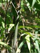 竿高6-10米,直徑2-5厘米,竿壁厚5-10毫米,梢端下垂;節(jié)間灰綠色,長20-35厘米,在其上半部被有白色粗硬毛。竿每節(jié)有多枝簇生,主枝不明顯。籜鞘早落性,革質(zhì),背面貼生易脫落的棕黑色小刺毛,以后變無毛;籜耳不明顯;籜舌高1-2.5厘米,邊緣作不規(guī)則的齒裂;籜片直立,披針形或卵狀三角形,基部向內(nèi)作圓形收窄,并沿鞘頂稍外延。末級小枝具8-10葉,葉鞘被棕色至灰白色柔毛,以后變?yōu)闊o毛;縱肋顯著;葉耳不存在,葉舌高1.5-3.5毫米,邊緣生細纖毛;葉片線狀披針形,長15-20厘米,寬約1.5-2.5厘米,下表面灰白色,上表面無毛,惟近邊緣則粗糙,葉緣之一側(cè)或兩邊均具小鋸齒而糙澀,次脈6-9對,小橫脈不存在,但常具透明微點以代之;葉柄長約2.5毫米。花枝無葉,細長,節(jié)間長2.5-7.5厘米,無毛,每節(jié)輪生有10-20枚假小穗;小穗纖細,長1.5-2厘米,寬僅2.5毫米,?;?,含1或2朵小花,并在下方混雜有1朵不孕的雄性小花,全體無毛;穎2或3片,卵形,先端急尖,邊緣具白色纖毛;外稃長橢圓形,先端急尖或有淺裂,具多脈,邊緣常內(nèi)倦,亦生有白色纖毛;內(nèi)稃較其外稃為短或常甚短,卵形而先端鈍,背部具2脊,脊上生纖毛,但上方一朵小花的內(nèi)稃則無脊而背部圓卷,僅其尖端處生纖毛;花藥能伸出花外,黃綠色,被較長的微毛,先端有小尖頭;花絲起初連合成一粗短的花絲管,惟以后則增長而為膜質(zhì)的花絲管;子房狹卵形,被微毛,向上漸變?yōu)榧氶L的花柱,柱頭白色,單一或2裂。穎果未見。
