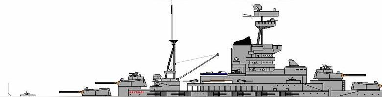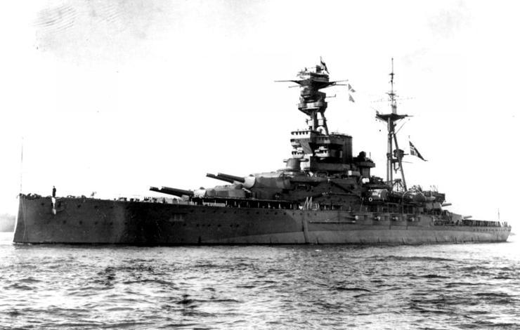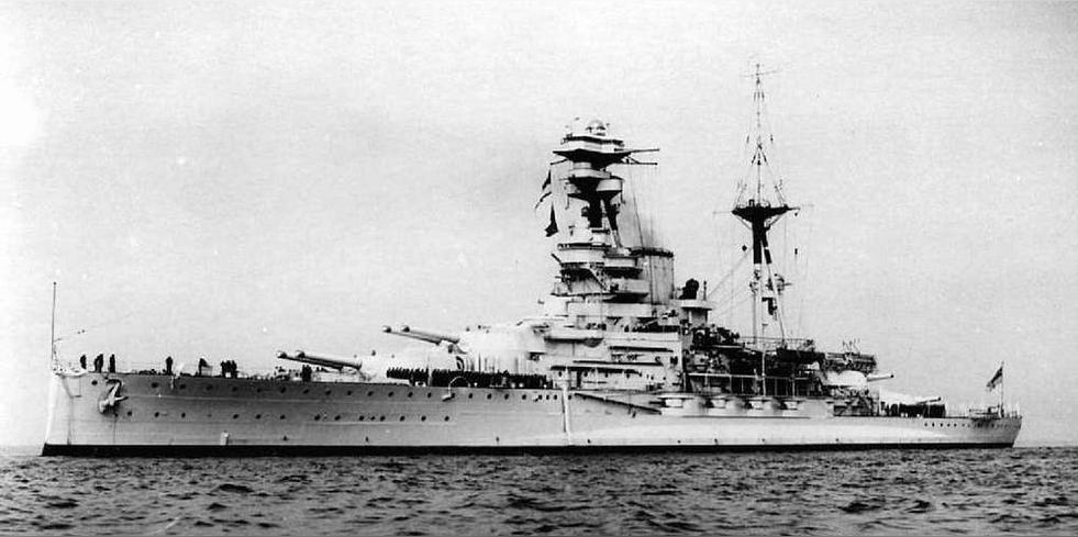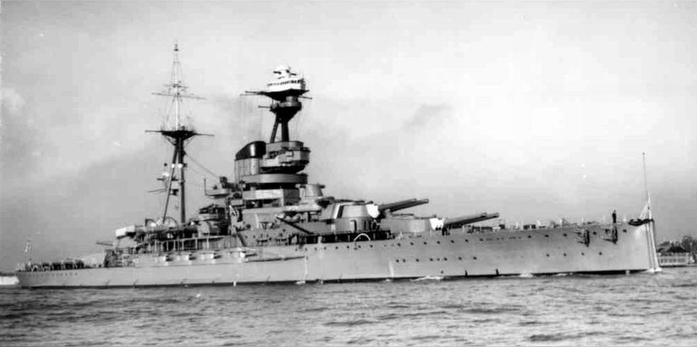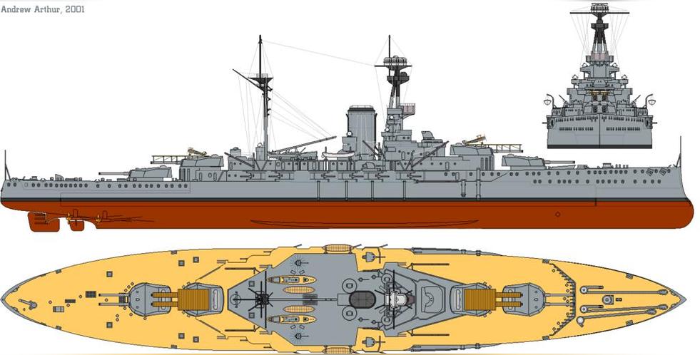 武備:4座雙聯(lián)裝15英寸/42倍口徑主炮;14門6英寸/45倍口徑炮廓副炮;2門76毫米炮;水下533毫米魚雷發(fā)射管4座(1940年拆除).第二次世界大戰(zhàn)期間加裝40毫米和20毫米高射炮大口徑防空炮改為4寸防空炮;