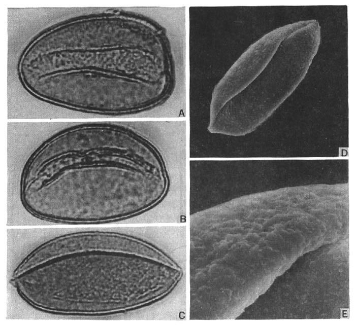 Diuranthera?inarticulata?Wang?et?K.?Y.?Lang?花粉?(朱兆義?1185,PE);(A)?遠(yuǎn)極面觀,表示單槽?(張開),LMX1000;(B)?斜遠(yuǎn)極面觀,表示單槽?(未張開),LMX1000;(C)?側(cè)面觀,LMX1000;(D)?遠(yuǎn)極面觀,表示單槽,SEMX1200;(E)?紋飾細(xì)節(jié),SEMX6000。