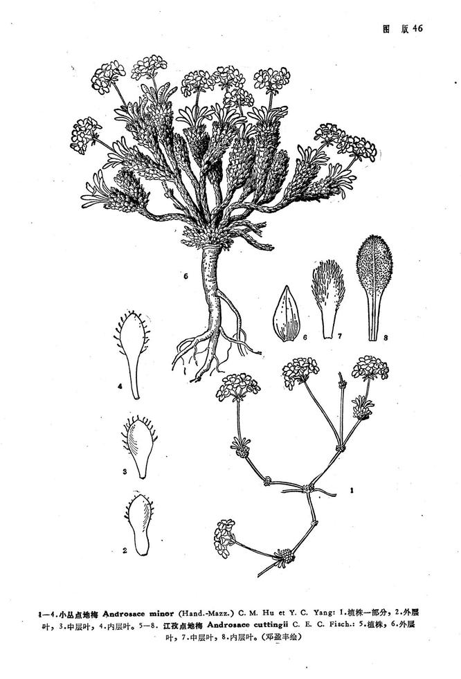 葉3型,外層葉卵形至卵狀披針形,長3.5-5毫米,通常為越年枯葉所遮蓋,褐色,干膜質(zhì),兩面近于無毛,邊緣具疏緣毛;中層葉長圓狀舌形至線狀匙形,長3-6毫米,質(zhì)地稍厚,背面上半部密被白色長毛,下半部褐色,無毛,腹面僅上半部近邊緣被毛;內(nèi)層葉倒披針形至倒卵狀匙形,長5-15毫米,寬2-4 (5) 毫米,草質(zhì),先端稍鈍,基部漸狹,兩面密被短硬毛?;ㄝ愀?-20毫米,被白色長柔毛;傘形花序3-6 (10) 花;苞片線形至線狀匙形,長3-4毫米,先端銳尖或鈍,被短柔毛和頭狀腺體;花梗通常短于苞片,長1-2 (3) 毫米;花萼鐘狀,長2.5-3毫米,被短柔毛,分裂約達(dá)全長的2/5,裂片卵形至卵狀三角形,先端鈍或稍銳尖,邊緣具白色緣毛;花冠白色或粉紅色,直徑5-7毫米,筒部壇狀,稍短于花萼,裂片倒卵形至闊倒卵形,近全緣。蒴果近球形,約與宿存花萼等長。
