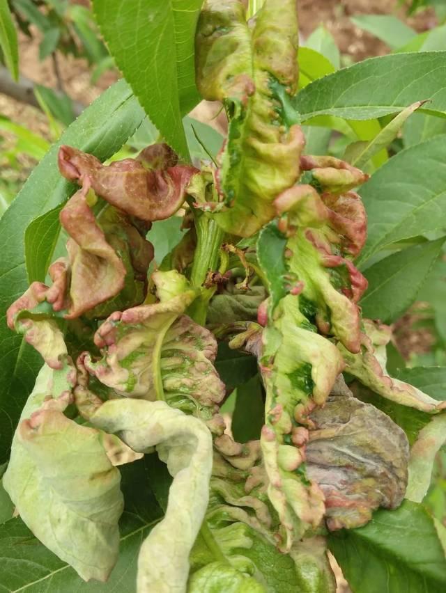 該病主要危害葉片,也可危害嫩枝和幼果。春天發(fā)芽時,感病嫩葉呈卷曲狀、發(fā)紅;葉片長大后增厚且變脆、卷曲,呈紅褐色,在葉片表面長出銀白色粉狀物,病葉變褐色,焦枯脫落,腋芽再次長出新葉,長出的新葉一般不再受害。嫩枝發(fā)病,呈灰綠色或黃色,節(jié)間縮短,略為粗腫,病枝上常簇生卷縮的病葉,嚴重時病枝漸向下枯死,甚至有的大枝或全株枯死。幼果發(fā)病,初生黃色或紅色病斑,微隆起;隨果實增大,漸變褐色;后期病果畸形,果面龜裂,有瘡疤,易早期脫落。較大的果實受害,果實變紅色,病部腫大,茸毛脫落,表面光滑。