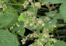 纏繞草本,莖、枝、葉柄均具倒鉤刺。葉紙質(zhì),腎狀五角形,掌狀5-7深裂稀為3裂,長寬約7-10厘米,基部心臟形,表面粗糙,疏生糙伏毛,背面有柔毛和黃色腺體,裂片卵狀三角形,邊緣具鋸齒;葉柄長5-10厘米。雄花小,黃綠色,圓錐花序,長約15-25厘米;雌花序球果狀,徑約5毫米,苞片紙質(zhì),三角形,頂端漸尖,具白色絨毛;子房為苞片包圍,柱頭2,伸出 苞片外。瘦果成熟時(shí)露出苞片外。花期春夏,果期秋季。