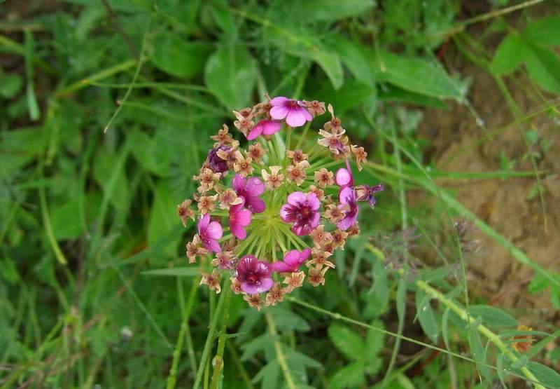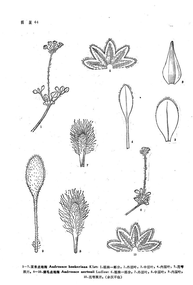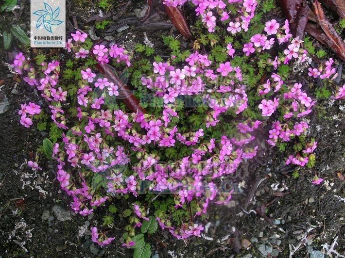 多年生草 本,植株由著生于根出條上的蓮座狀葉叢形成疏叢。根出條棗紅色,初被柔毛,漸變無毛,節(jié)間長0.5-2.5厘米。蓮座狀葉叢直徑1-2厘米,基部具殘存的枯葉;葉3型,外層葉線狀長圓形,長4-5毫米,寬約1.5毫米,早枯,褐色,近先端及邊緣被毛;中層葉匙形至線狀倒披針形,長4-7.5毫米,寬0.75-1.5毫米,先端鈍,綠色,除漸狹的膜質(zhì)基部外,密被長1.5-2.5毫米的白色絹絲狀長毛;內(nèi)層葉具柄,葉片橢圓形至卵狀橢圓形,長3.5-6毫米,寬2-4毫米,先端鈍,基部短漸狹,下延,兩面被短硬毛;葉柄等長于或稍長于葉片;著生于新枝端的葉2-4對,長4-5毫米,卵圓形,被短柔毛。花葶細(xì)弱,高2-6厘米,被開展的長柔毛;傘形花序2-6花;苞片線形,長2-3.5毫米,被柔毛;花梗被柔毛,初花期甚短,約與苞片等長,至果期長可達(dá)9毫米;花萼杯狀,長約3毫米,密被柔毛,分裂達(dá)中部,裂片狹卵形,先端稍鈍;花冠紫紅色,直徑6-9毫米,筒部長2.5-2.75毫米,裂片闊倒卵形,全緣或先端微具小齒。花期6月。