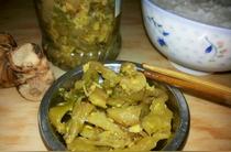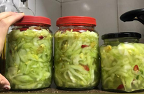 分批裝進(jìn)若干個(gè)小玻璃瓶子里(便于分開食用和保存),用牙簽在瓶口內(nèi)十字架壓實(shí)芥菜條,蓋好口放陰涼處,等二個(gè)星期就能進(jìn)食了。