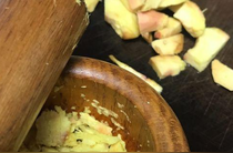 用粗鹽加南姜反復(fù)搓,搓掉青澀的汁,喜歡甜的別忘記加白糖粉一起搓揉,加一點(diǎn)白酒一起抓勻。