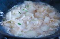 4.炒鍋放雞湯250克,加入海米、料酒、精鹽、味精,燒煮片刻;