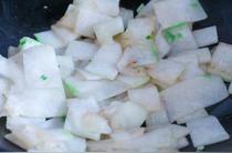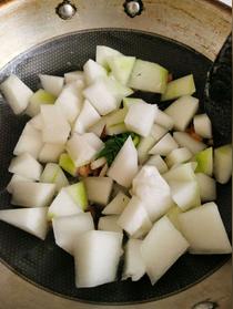 倒入冬瓜,轉(zhuǎn)大火,不斷地翻炒,炒至冬瓜表面變軟。