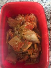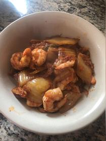 取一平底鍋熱油炒辣白菜,放糖和醬油繼續(xù)拌炒,然后放入煎好的蝦翻炒,出鍋前放鹽,即可。