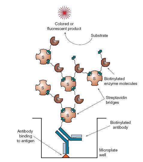 親和素是一種糖蛋白,一分子親和素可以與四個(gè)生物素小分子發(fā)生專一親和作用,類似抗原與抗體親和。它們之間的作用力是目前已知最強(qiáng)的非共價(jià)作用。80年代后,隨著生物素-親合素系統(tǒng)(BAS)作用被發(fā)現(xiàn),這一親和作用被結(jié)合應(yīng)用到ELISA技術(shù)上,大大提高了后者反應(yīng)的靈敏性與專一性。生物素很易與蛋白質(zhì)(如抗體等)以共價(jià)鍵結(jié)合。這樣,結(jié)合了酶的親和素分子與結(jié)合有特異性抗體的生物素分子產(chǎn)生反應(yīng),既起到了多級(jí)放大作用,又由于酶在遇到相應(yīng)底物時(shí)的催化作用而呈色,達(dá)到檢測未知抗原(或抗體)分子的目的。