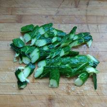 黃瓜去頭尾,從中間一分為二,用刀拍幾下,斜刀片成均勻的塊。