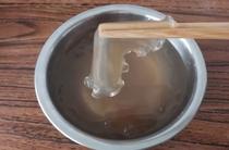 粉皮從塑料袋中取出,切成均勻的塊。