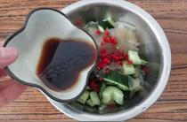 3. 碗中加芝麻醬、芥末油、辣椒油、香油、精鹽、醋調(diào)勻澆在粉皮、黃瓜上即成。
