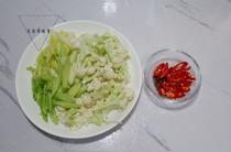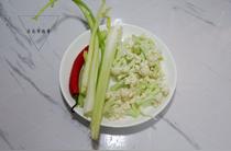 西芹去葉斜刀切成小段,菜花摘成小朵,辣椒切圈花椒備好