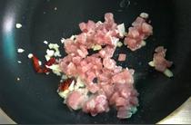 熱油鍋,加入干辣椒和蒜泥煸炒,加入肉末。