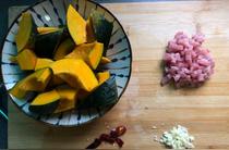 南瓜切丁,里脊肉切丁,大蒜搗碎,干辣椒備好。
