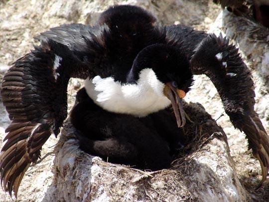 雙親都參加撫育雛鳥工作,喂雛的方法是把魚貯藏于粗大的食管內(nèi),在喂食時,親鳥張開嘴,雛鳥伸嘴入親鳥的咽部,在親鳥的口腔內(nèi)啄食半消化的魚肉。喂水時,親鳥將取來的淡水從嘴噴出,注入雛鳥嘴里。雛屬晚成性。