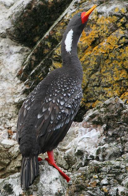 紅腿鸕鶿,英文名稱:Red-legged Cormorant,命名時間:1828 年。是一種水鳥,體長約800毫米,全身羽毛主要是灰色,黑頭和脖子,黑翼上布滿白色斑點,灰色胸口和腹部,脖子的兩側(cè)有大塊白色斑紋,黃色的喙,在喙的根部是紅橙色,腳也是紅橙色。