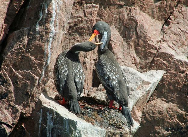 孵28天左右出雛。雙親都參加撫育雛鳥工作,喂雛的方法是把魚貯藏于粗大的食管內(nèi),在喂食時,親鳥張開嘴,雛鳥伸嘴入親鳥的咽部,在親鳥的口腔內(nèi)啄食半消化的魚肉。喂水時,親鳥將取來的淡水從嘴噴出,注入雛鳥嘴里。雛屬晚成性。
