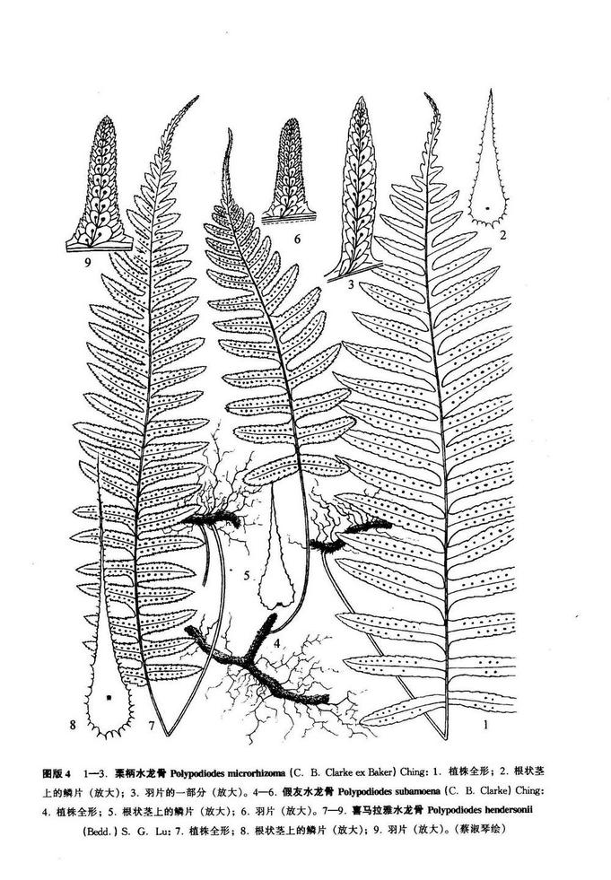 附生植物。根狀莖長(zhǎng)而橫走,密被鱗片,連同鱗片粗約2-3毫米;鱗片卵狀披針形,棕色或褐棕色,基部闊,盾狀著生,頂端漸尖,邊緣近全緣。葉遠(yuǎn)生;葉柄長(zhǎng)約5-10厘米,禾稈色,光滑無(wú)毛;葉片披針形或卵狀披針形,長(zhǎng)約15-20厘米,寬約5-8厘米,羽狀深裂,基部收縮,心形,頂端尾尖或羽裂漸尖;裂片約10-15對(duì),最多可達(dá)20對(duì),條形,長(zhǎng)約3-4厘米,寬約8-10毫米,頂端鈍圓或短漸尖,邊緣有重鋸齒或粗鋸齒,基部1對(duì)明顯縮短并向后反折。葉脈明顯,網(wǎng)狀,在葉軸兩側(cè)及裂片中脈兩側(cè)各具1-2行網(wǎng)眼,裂片兩側(cè)的內(nèi)行網(wǎng)眼具內(nèi)藏小脈。葉草質(zhì),干后綠色,兩面無(wú)毛,表面光滑,背面疏被闊卵形、褐色、邊緣有齒的鱗片。孢子囊群大,圓形,在裂片中脈兩側(cè)各1行,著生于內(nèi)藏小脈頂端,靠近中脈著生,無(wú)蓋。
