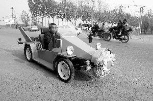 唐振平的“跑車”有前后兩個(gè)發(fā)電裝置,車尾處有電池,車頭有電風(fēng)扇。這輛車最大的特點(diǎn)是,主要靠風(fēng)力發(fā)電行駛,電池兩三天充一次電就行了。車子高不過1米,長(zhǎng)兩三米,車上反光鏡、剎車燈、轉(zhuǎn)向燈……一應(yīng)俱全,跑起來最高時(shí)速能達(dá)到140公里。車開到時(shí)速60公里,仍很穩(wěn)定,小巧靈活。