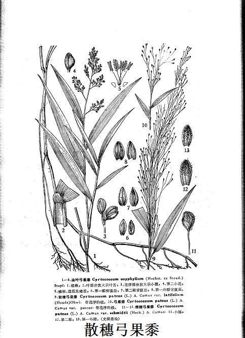 散穗弓果黍(變種) (學(xué)名:Cyrtococcum patens (L.) A. Camus var. latifolium (Honda) Ohwi)屬于 黍亞族 弓果黍 物種植物。